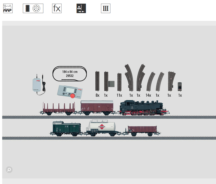 Märklin 29532. Startsæt AC digital. Lokomotivet har 5 polet højtydende motor og er udrustet med "Telex" koblinger, så der kan kobles til og fra overalt på banen.