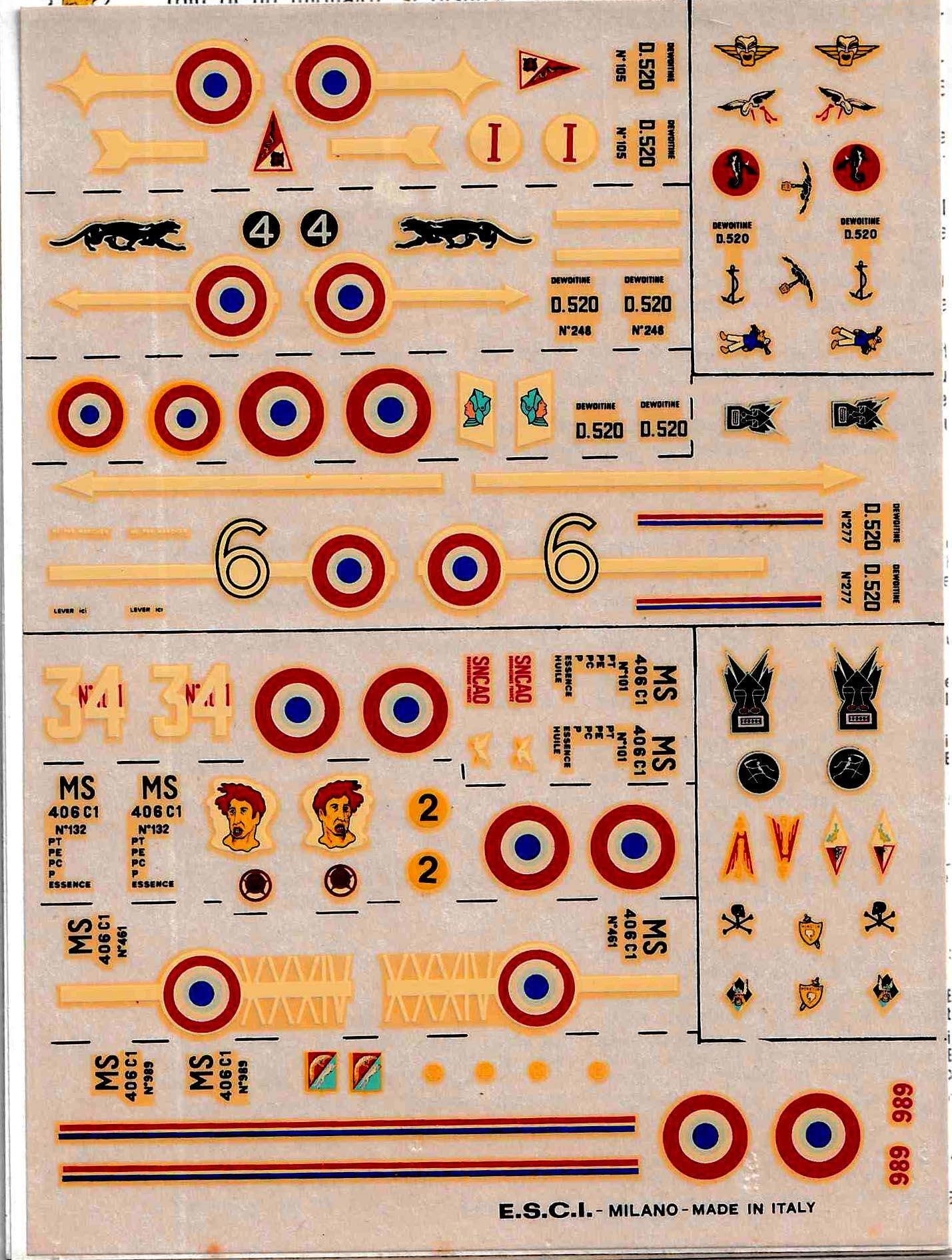 E.S.C.I. N 6 Decals. France.MORANE SAULNIER 406 - DEWOITINE 520. Decaler til flyvemaskiner skala 1/72